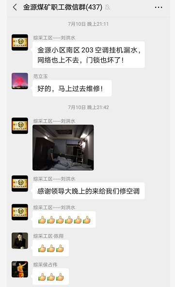 7月10日晚9点,在看到FUN乐天使官方网站职工微信群里的信息后,后勤维修服务队立即奔赴离矿三公里外的小区宿舍,将职工反应问题进行处理,半小时后,职工宿舍的空调、网络等问题都顺利解决,微信群内“点赞刷屏”。