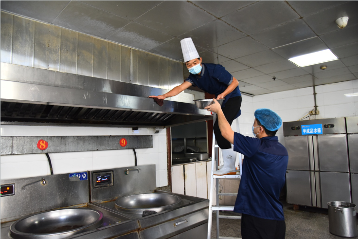 “鞠哥,递给我清洁刷和百洁布,再倒点洗洁精。风机沟槽里的油太多了,需要好好清理一下,还能给我个大一点的盆吗?”厨师长的话音刚落,鞠大哥便急速扶好梯子,180度转身,手上捧着早已准备好的盆,犹如一幕默契的舞蹈。鞠哥眯起双眼:“站稳喽,万一需要英雄救美,我可准备好了。”这番调侃引得大家忍俊不禁,现场挥舞的汗水在笑声中溅起。