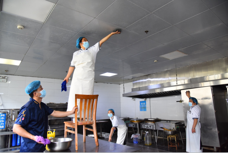 在面点房,女员工们也是意气风发,没有梯子,她们便自行打造了一个:桌子放地上,凳子叠加上去,短短片刻,一台临时梯子就巧妙搭建完成。站在凳子上的“小个子班长”一手拿刷子,一手抹布,汗水顺着头发滑落,面对高处的工作,她无畏地宛如现代版的刘胡兰,勇气与毅力在她的动作中呈现,不久,顽固的污渍得以一一抹去。旁边的帮手们也全力以赴,工作服早已湿透,笑声在闷热中回响。